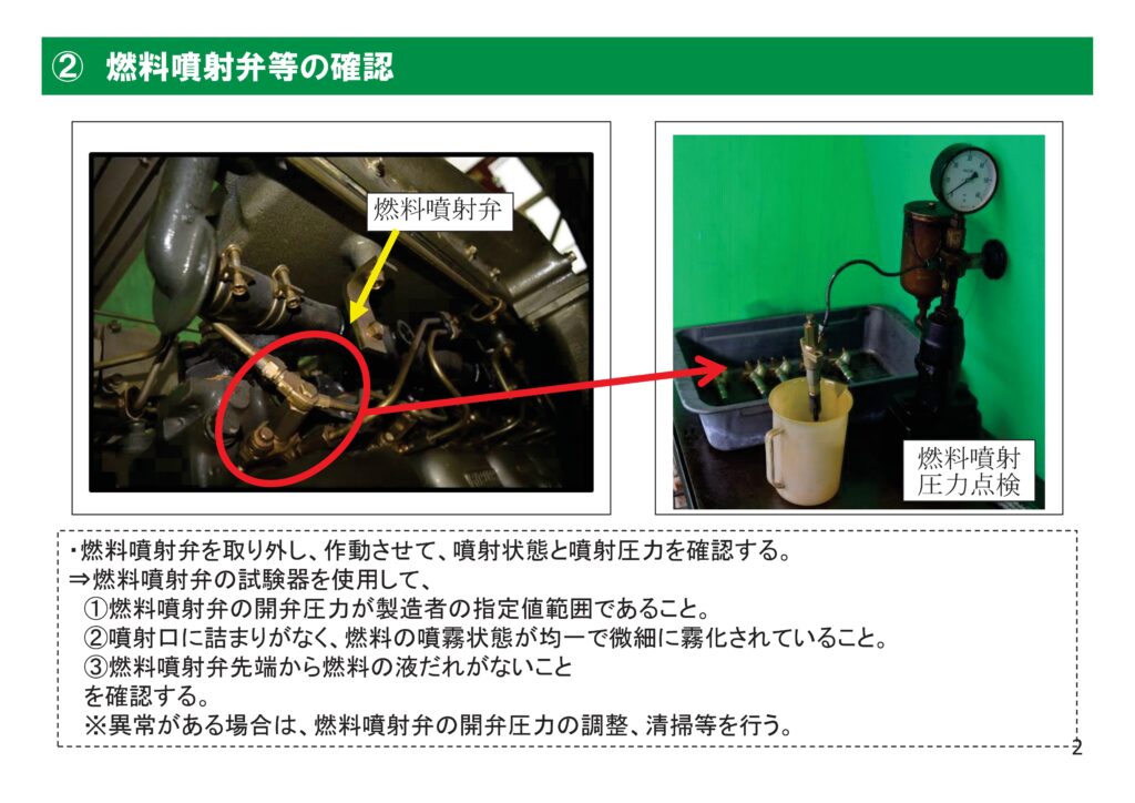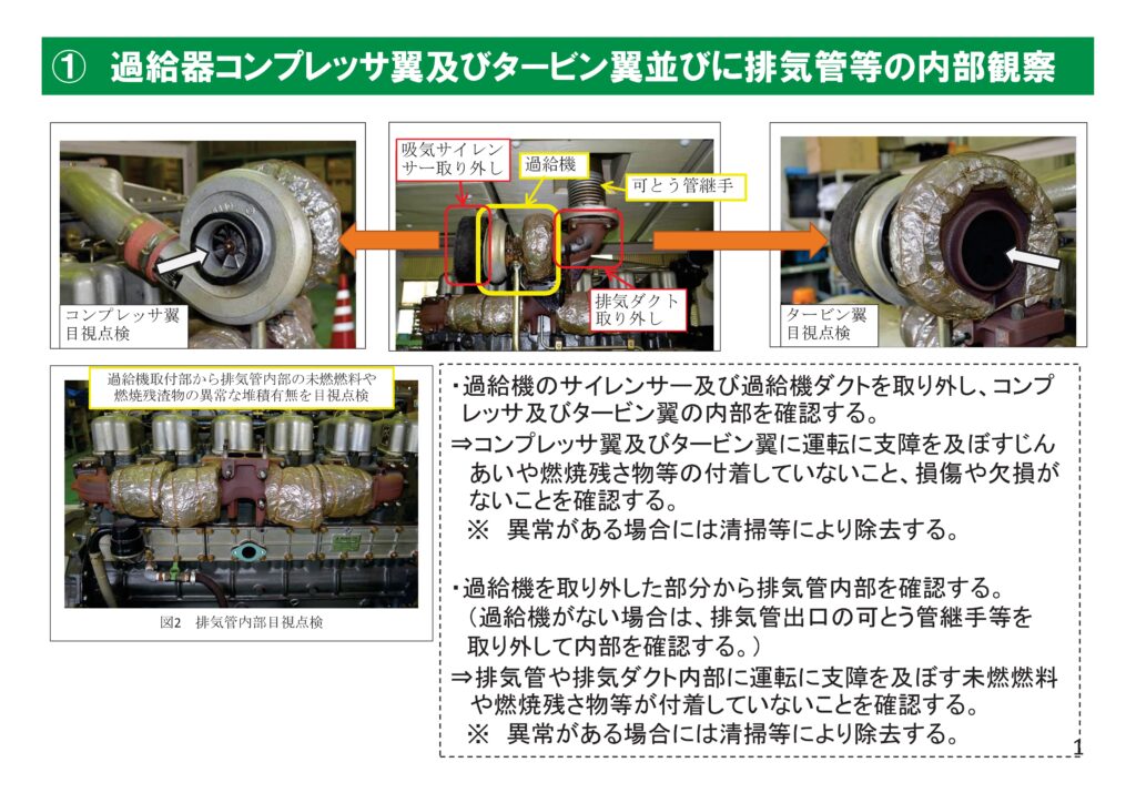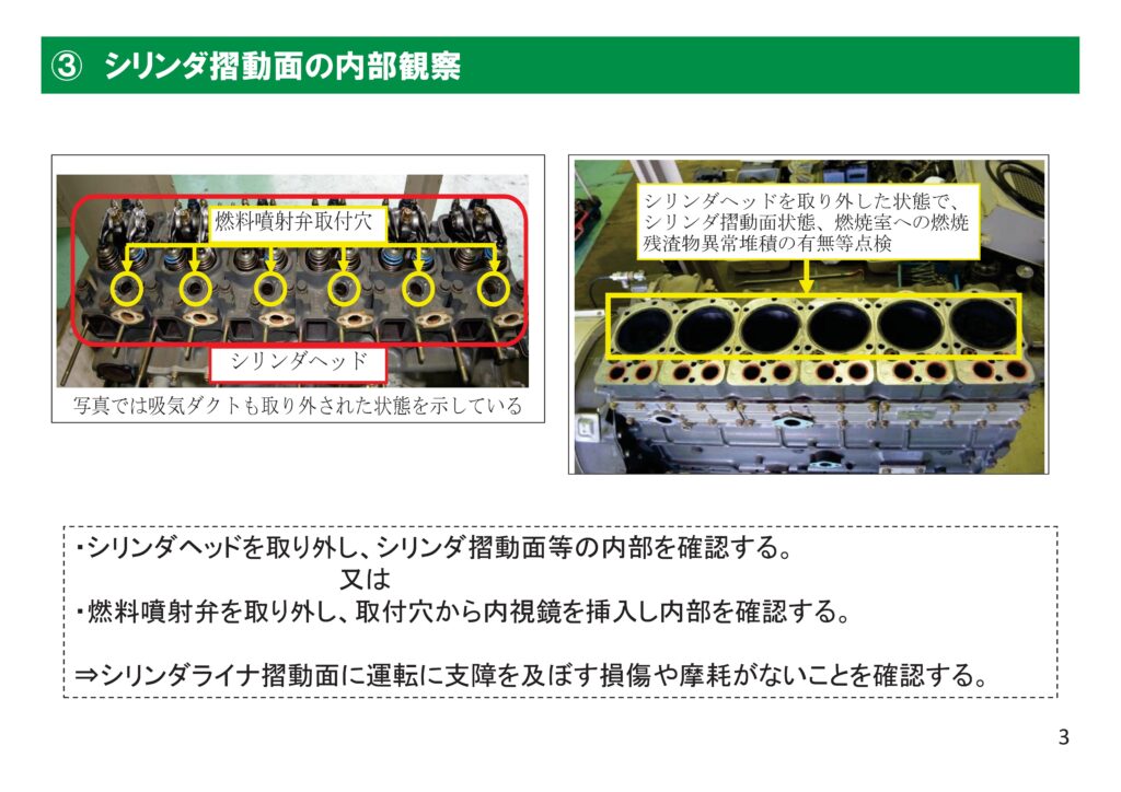 内部観察とは、エンジン内部や主要部品の状態、潤滑油・冷却水・燃料系統などを確認し、