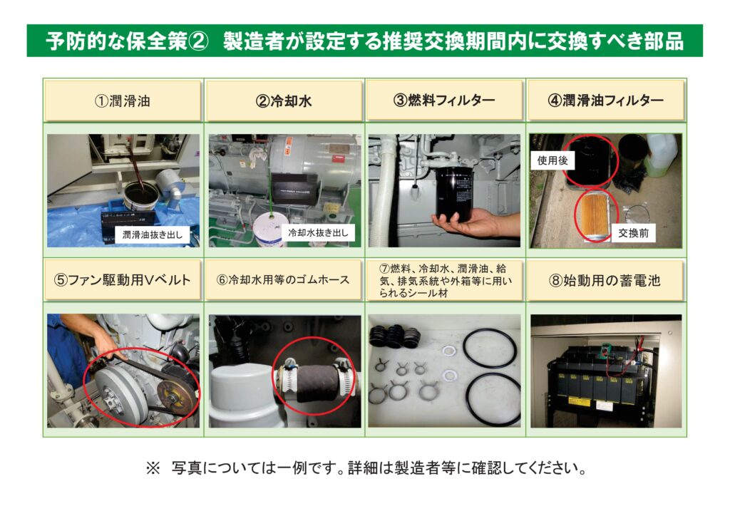 消耗部品の交換や整備を計画的に行い、発電機の健全な状態を維持するための取り組みです。